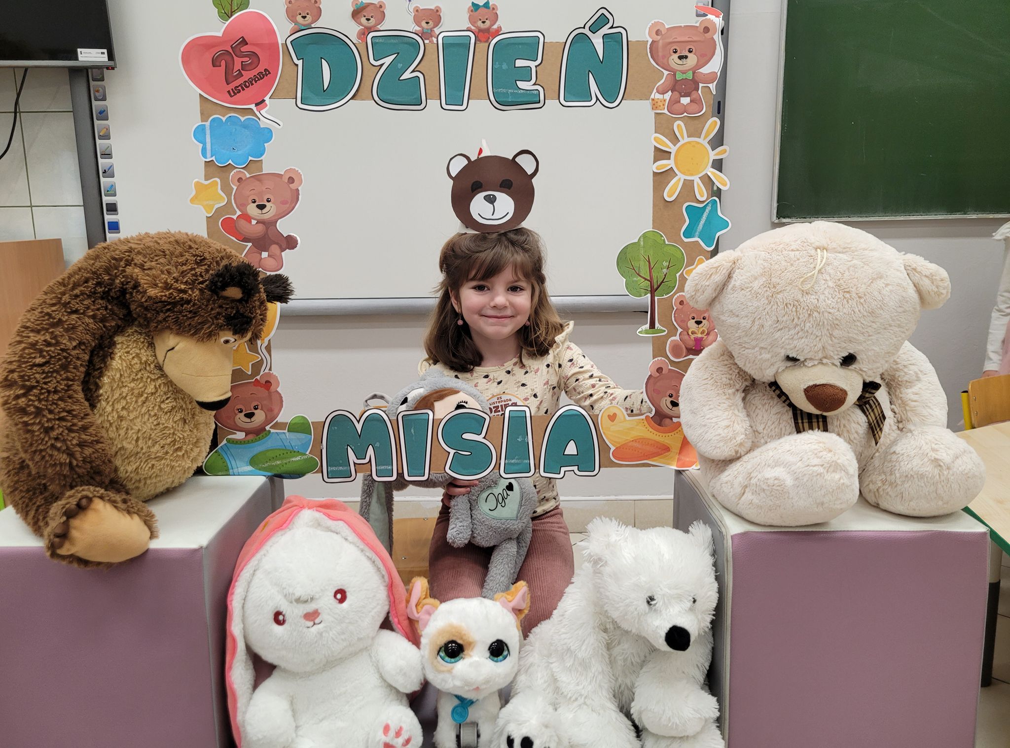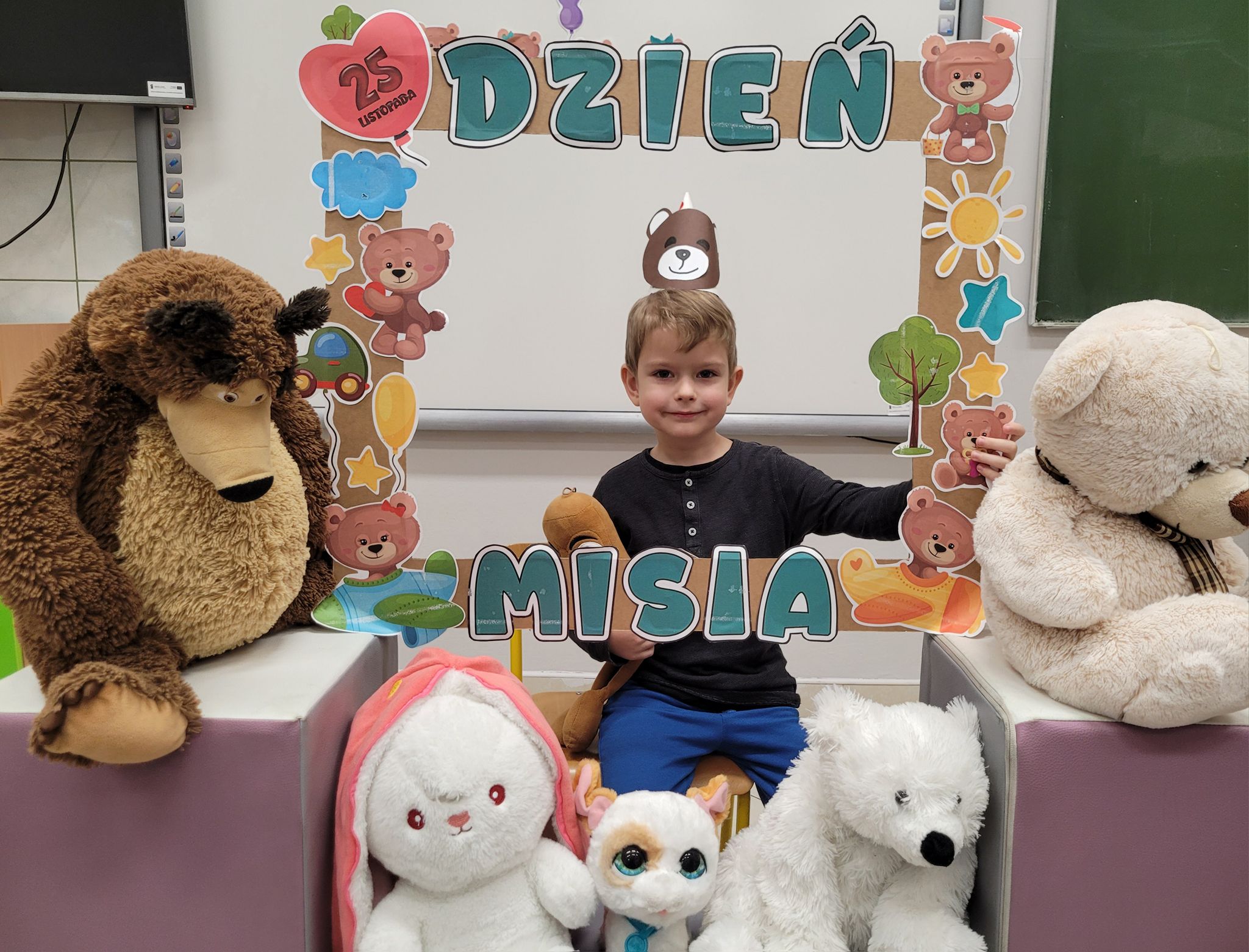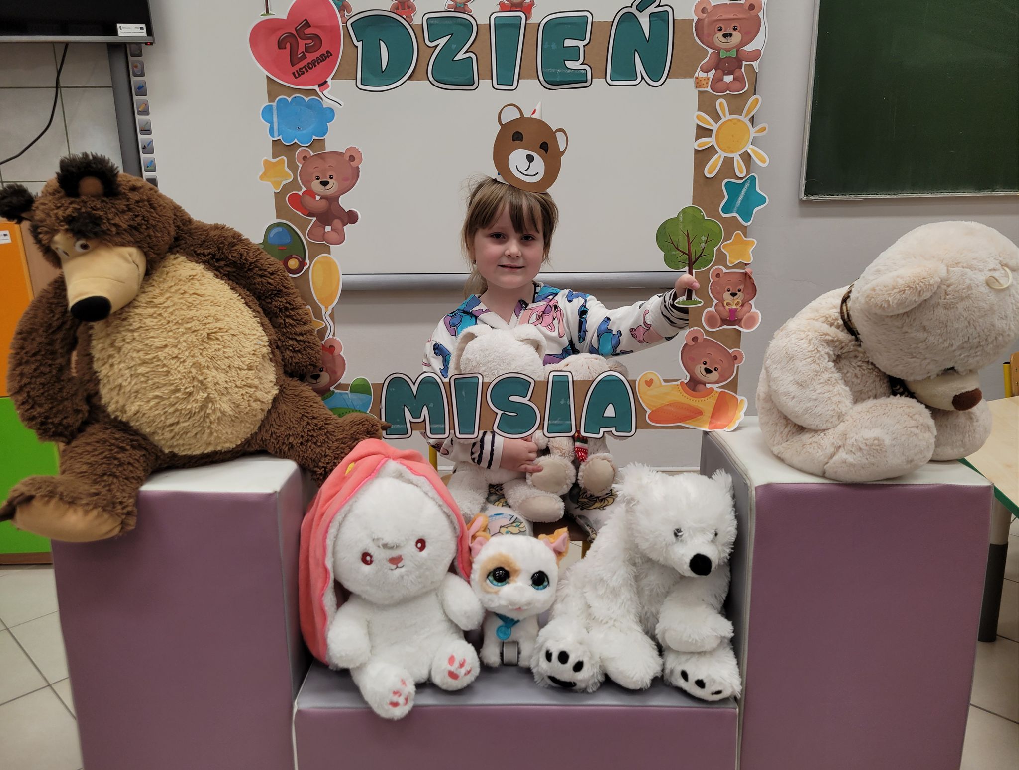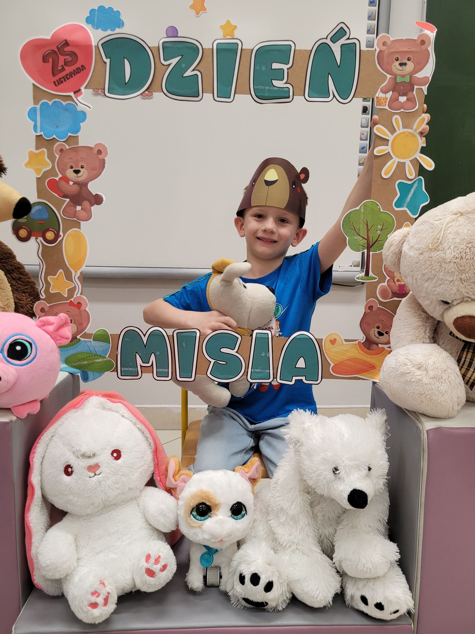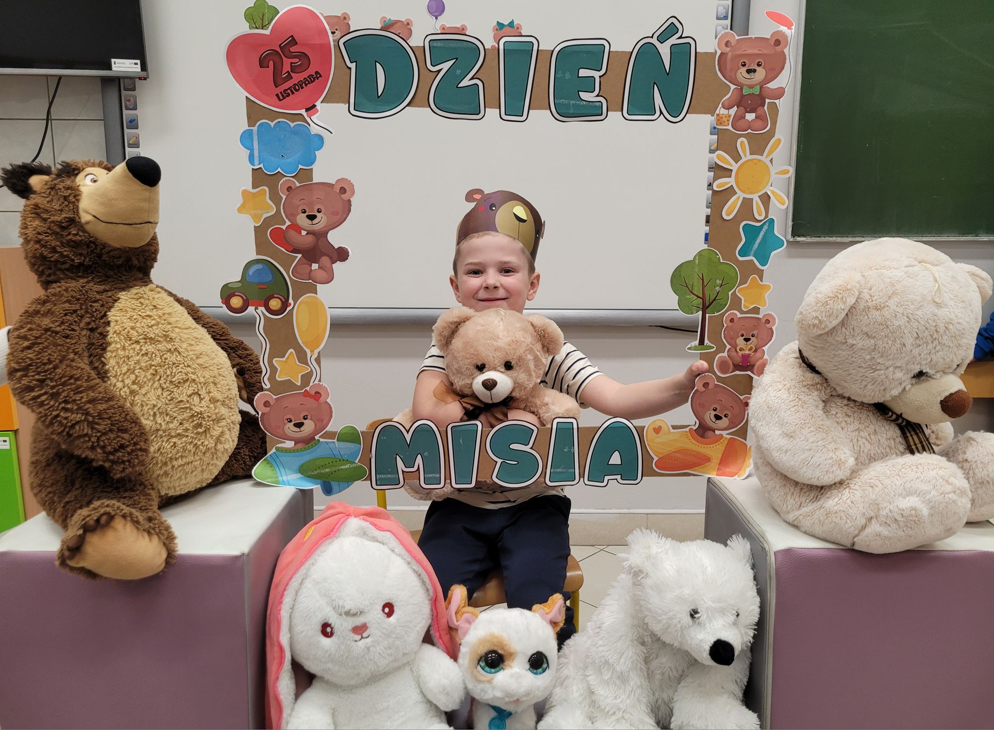 Dnia 25 listopada dzieci z grup 0a i 0b oraz klasy 1-3 obchodziły Dzień Pluszowego Misia. Z tej okazji przygotowano dla nich specjalne zajęcia, które przeniosły uczniów w świat bajkowych bohaterów. Tego dnia każde dziecko przyniosło do klasy swojego ukochanego pluszaka z, którym z radością dzieliło się z rówieśnikami. Na początku dnia dzieci obejrzały prezentację o najsłynniejszych misiowych postaciach z bajek. Poznały takie misie jak: Miś Uszatek, Colargol, Paddington, Kubuś Puchatek, Miś Yogi oraz Gumisie. Dzieci dowiedziały się, czym charakteryzuje się każdy z bohaterów – że Kubuś Puchatek uwielbia miód, Paddington zajada się kanapkami z marmoladą, a większość misiów to prawdziwe łasuchy, które jednocześnie są bardzo życzliwe, pomocne i przyjacielskie. Najmłodsi uczniowie wysłuchali również opowiadań i wierszyków o bohaterach dzisiejszego święta, a następnie wspólnie zaśpiewali misiową piosenkę, tworząc radosną i pełną ciepła atmosferę. Dużą atrakcją była możliwość zrobienia sobie zdjęcia w specjalnej „misiowej ramce”, co sprawiło dzieciom wiele radości i pozwoliło uwiecznić ten wyjątkowy dzień.