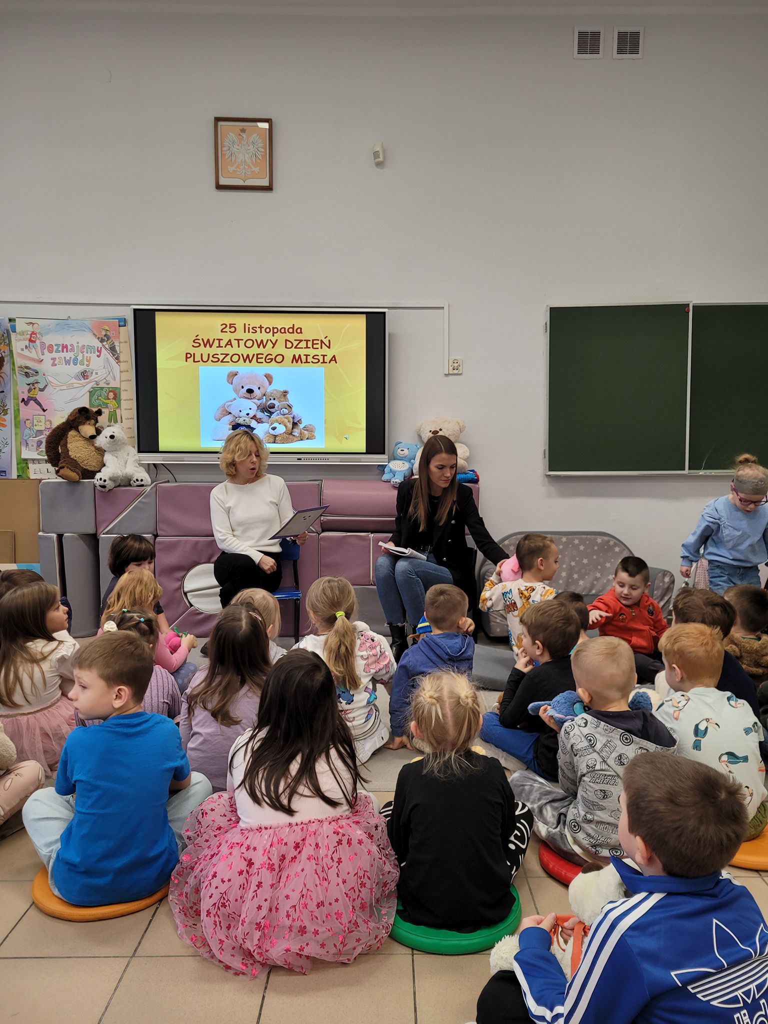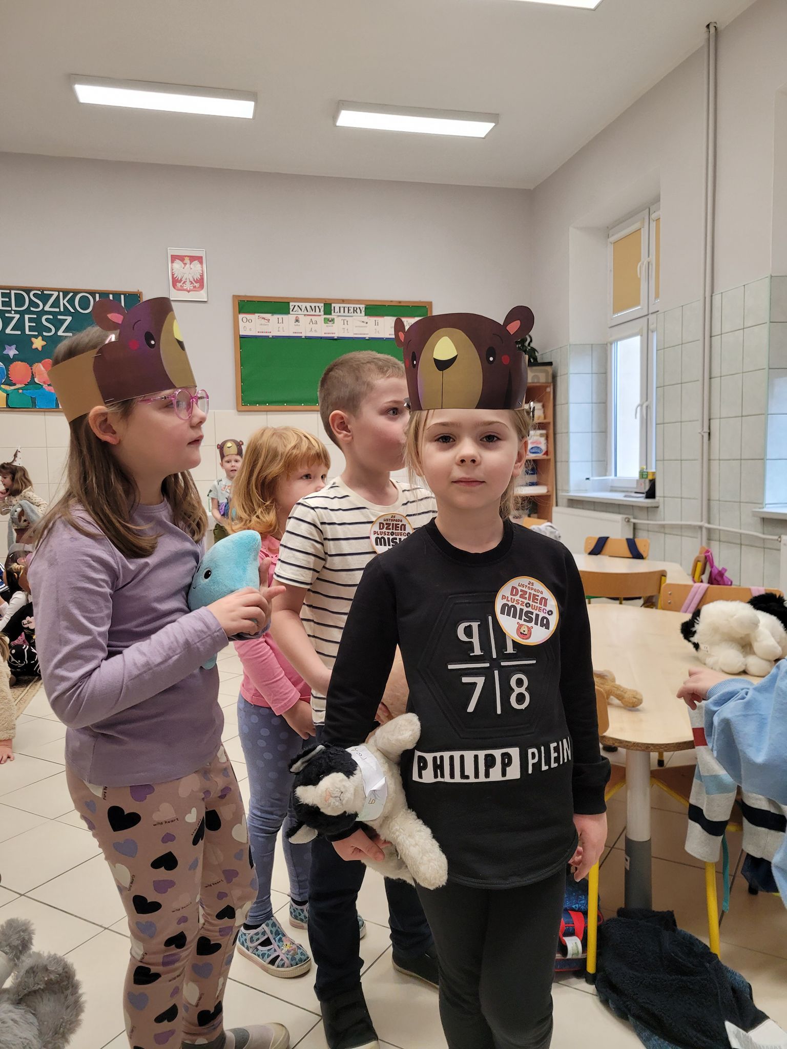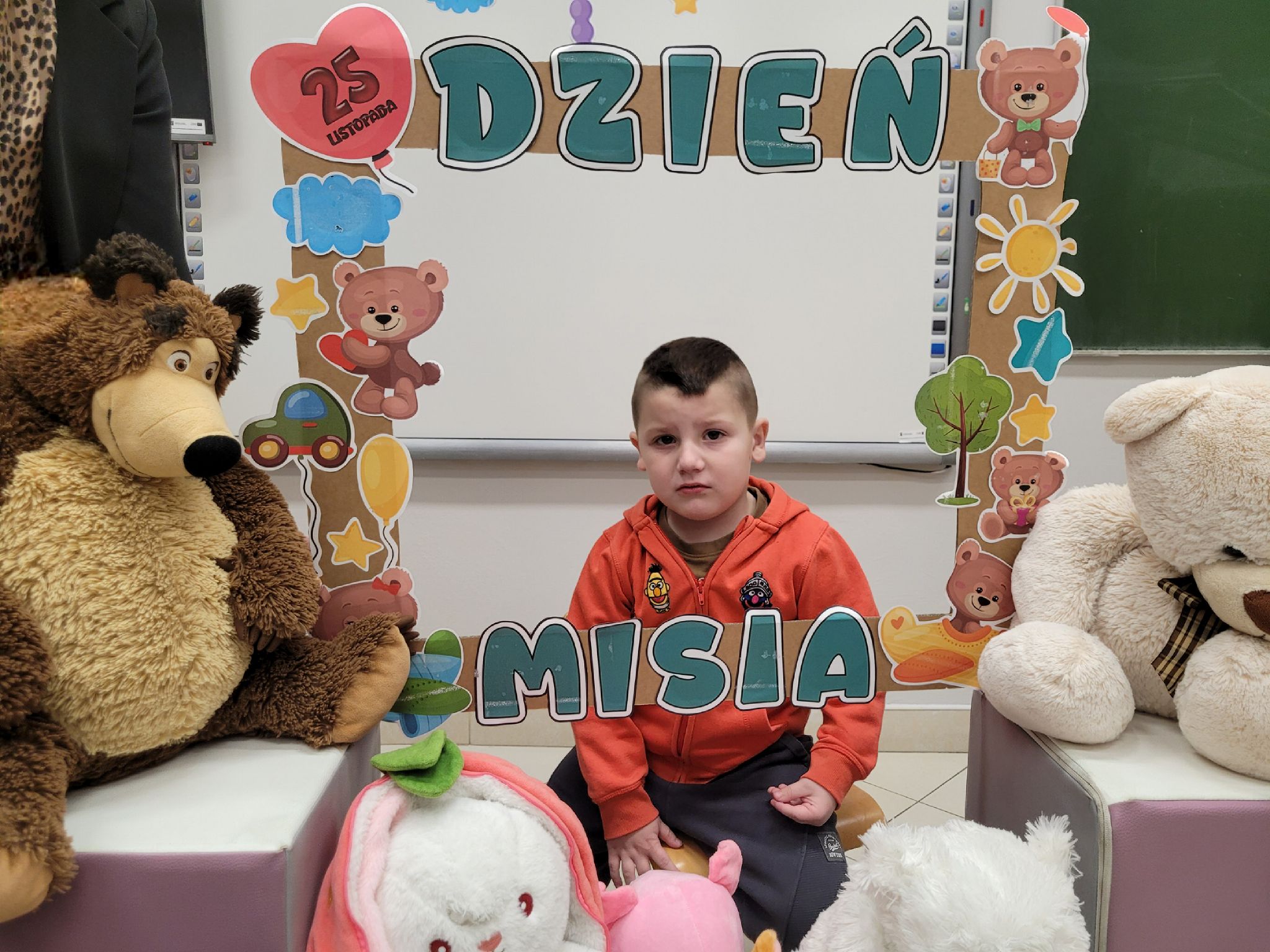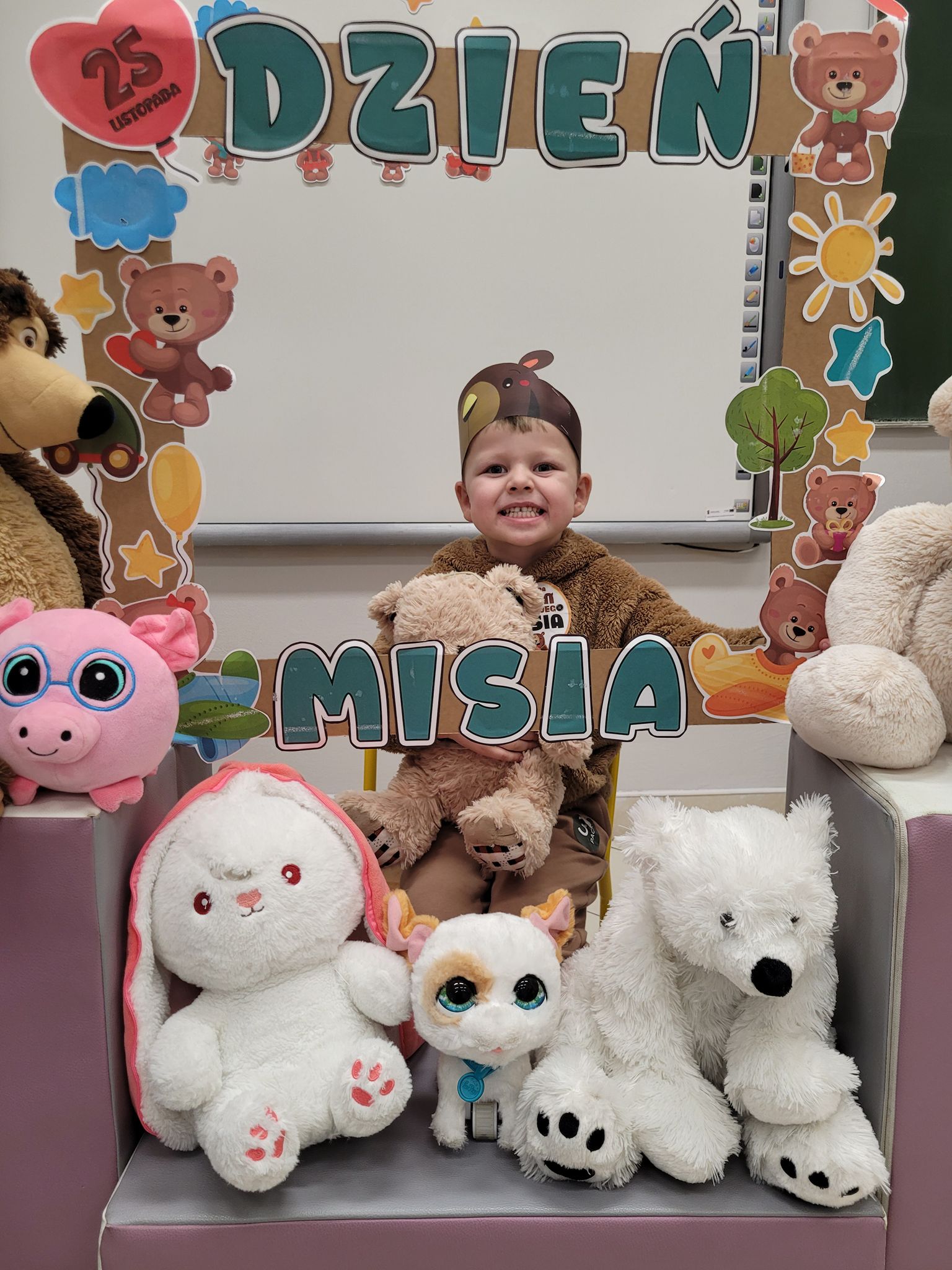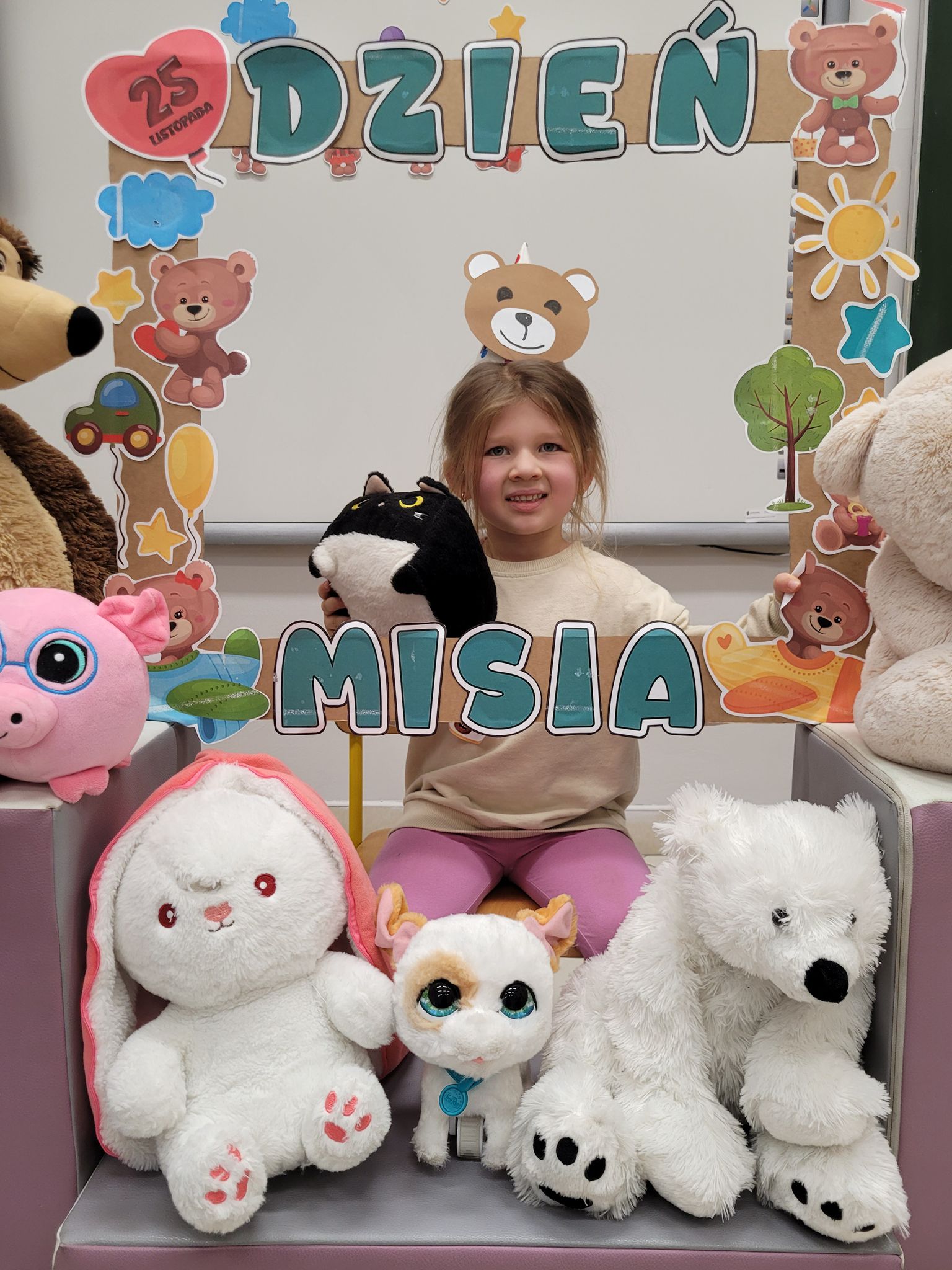 Dnia 25 listopada dzieci z grup 0a i 0b oraz klasy 1-3 obchodziły Dzień Pluszowego Misia. Z tej okazji przygotowano dla nich specjalne zajęcia, które przeniosły uczniów w świat bajkowych bohaterów. Tego dnia każde dziecko przyniosło do klasy swojego ukochanego pluszaka z, którym z radością dzieliło się z rówieśnikami. Na początku dnia dzieci obejrzały prezentację o najsłynniejszych misiowych postaciach z bajek. Poznały takie misie jak: Miś Uszatek, Colargol, Paddington, Kubuś Puchatek, Miś Yogi oraz Gumisie. Dzieci dowiedziały się, czym charakteryzuje się każdy z bohaterów – że Kubuś Puchatek uwielbia miód, Paddington zajada się kanapkami z marmoladą, a większość misiów to prawdziwe łasuchy, które jednocześnie są bardzo życzliwe, pomocne i przyjacielskie. Najmłodsi uczniowie wysłuchali również opowiadań i wierszyków o bohaterach dzisiejszego święta, a następnie wspólnie zaśpiewali misiową piosenkę, tworząc radosną i pełną ciepła atmosferę. Dużą atrakcją była możliwość zrobienia sobie zdjęcia w specjalnej „misiowej ramce”, co sprawiło dzieciom wiele radości i pozwoliło uwiecznić ten wyjątkowy dzień.
