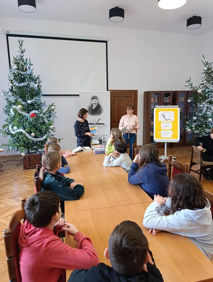 W dniu 17.12.2025r klasa IV b wraz z wychowawczynią Panią Moniką Podporą udała się do Biblioteki Miejskiej w Opocznie na lekcję biblioteczną. Uczniowie uczestniczyli w zajęciach, na których mogli poznać historię powstania książek. Dzięki uprzejmości pracowników biblioteki uczniowie mieli możliwość zwiedzić pomieszczenia na co dzień niedostępne dla czytelników. Największym zainteresowaniem cieszyła się wizyta w podziemiach i poznanie historii Esterki. Dziękujemy za zaproszenie i wspaniałe wrażenia.